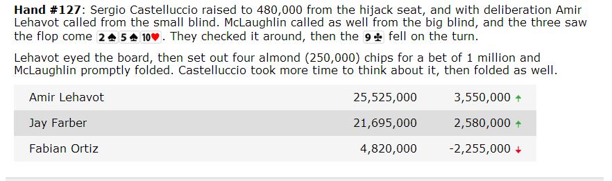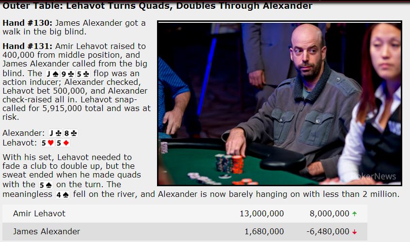 (I met Amir and his family in person yesterday. His gentility and unassuming nature were beyond refreshing to find in a poker pro under the age of fifty. He’s 38, the oldest at the Final Table, btw.)