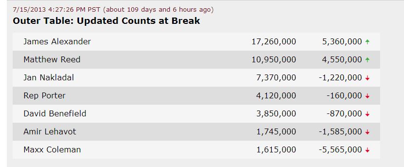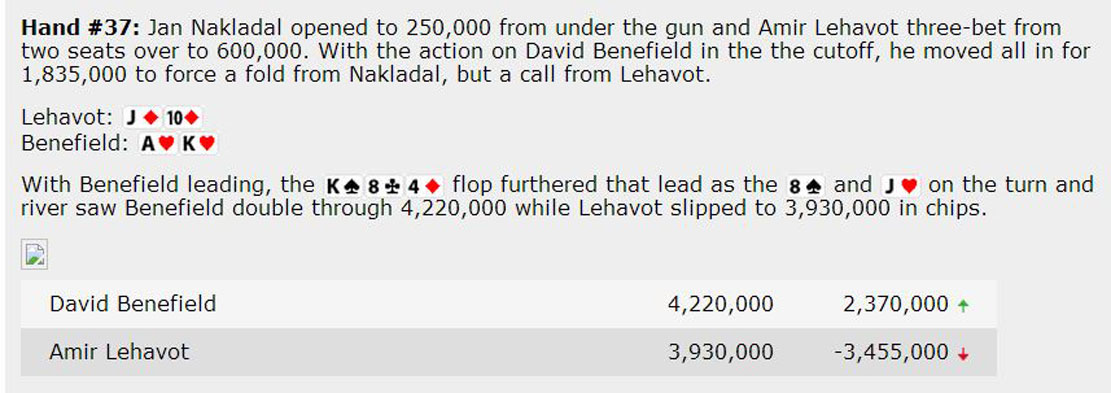 8. David Benefield. 6,375,000. Like Newhouse, short stacked – if he doubles up, look out world. He’ll play his short stack like a pro, and one lucky break could change everything. One personal note. Yes, he’s the kid some of you non-poker heads out there will want to root for. He quit the game while at its highest level a few years back to go back to college (Columbia) not to study business (ie how to play games and make more money, as many poker pros do who return to school), but to study Chinese and Political Science because they just plain interest him academically. Horrible podcast host Bernard Lee, who interviews the November Niners every year, seemed almost disgusted by Benefield’s choice, asked in a tone of why would anyone want to go back and study that?-ttreated Benefield like a freak for wanting to go to school to actually learn shit, not obtain a moneymaking goal. A little more of a sidenote about Lee’s radio sho. It’s awful. He never asks an interesting question, the audio quality is wretched, the list goes on. The first eight of the Niners went on the show and then Amir, at the last second, said no thanks. It was certainly in part a tactical move on Amir’s part, but perhaps a smidge was a response to Lee’s way of asking more than telling people they’re going on his show. Either way, while I was sad to turn in on the day Amir was supposed to be on, I was tickled to death that he pulled that move. Last note: The Benefield quitting story is a bit more hype than reality, he reduced his playing but never gave up the game. Benefield will surely have some big-time pros on his rail, offering advice, should he need it.